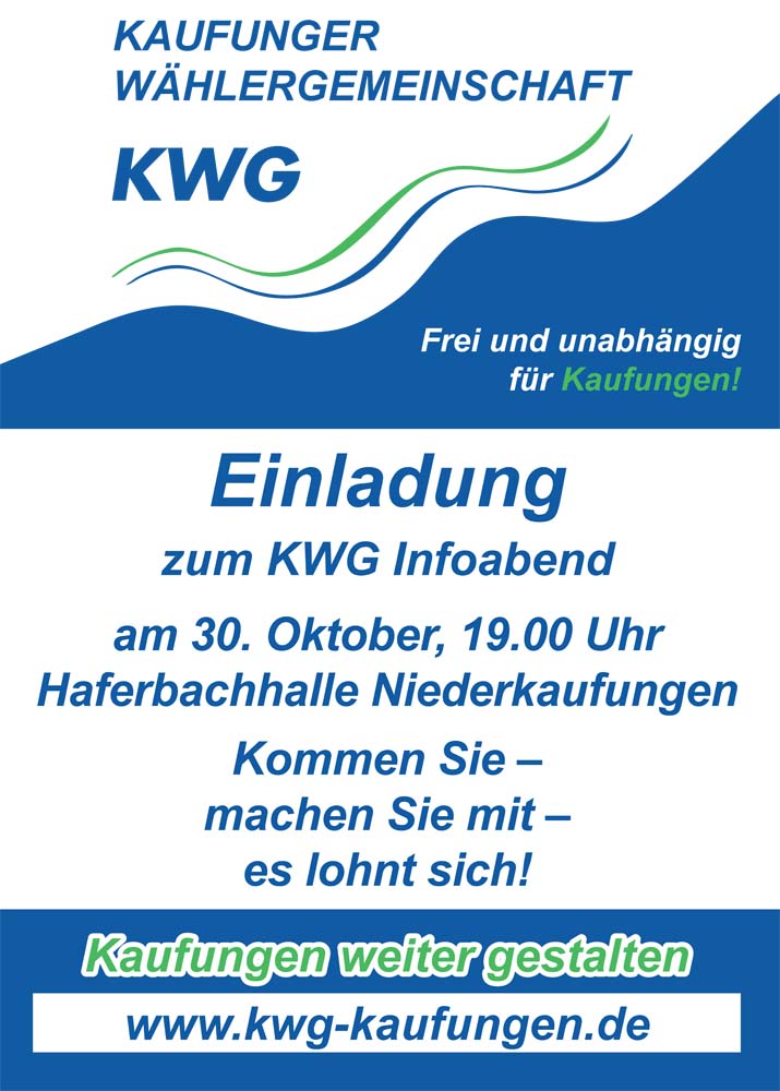 Eintritt frei, Getränke und ein kleiner Imbiss stehen kostenlos bereit*: Die KWGler stehen ihnen für Anregungen & Fragen zu der Zukunft Kaufungens gerne zu Verfügung!