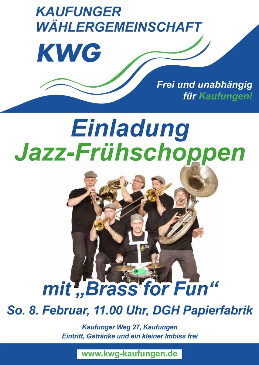 Einladung zum Jazz-Frühschoppen der KWG am Sonntag den 8. Februar ab 11 Uhr im Dorfgemeinschaftshaus Papierfabrik